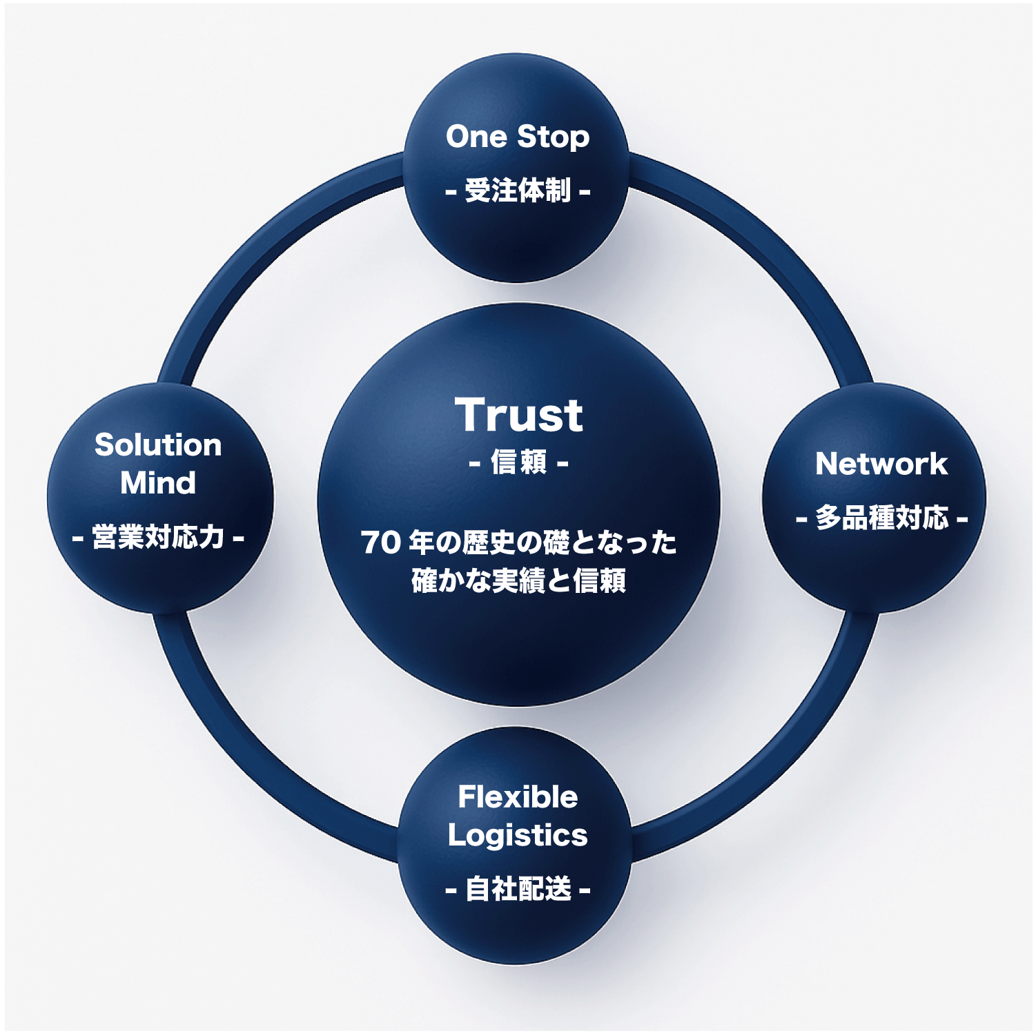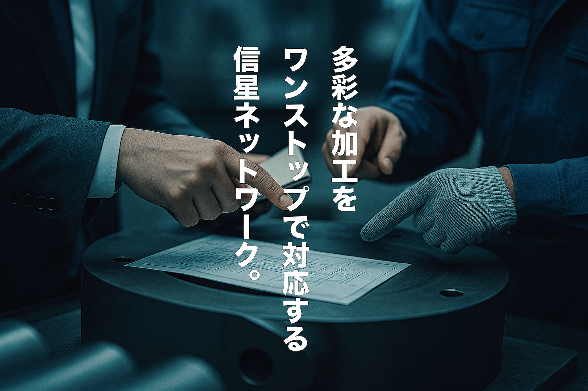 鉄鋼製品から加工製品まで幅広く対応できるのは、70年で築いた信星ネットワークがあるから。鉄鋼メーカーや商社とのパートナーシップで多品種を確保し、加工は技術力を有する多彩な専門業者と連携。「どこに頼めばいいかわからない鉄鋼」こそ、私たちの出番です。